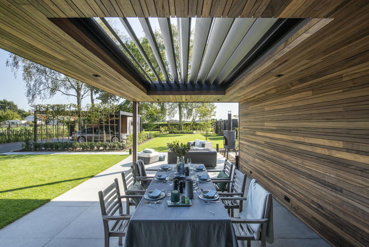 Терраса Renson Aero оснащена солнцезащитной и водостойкой крышей с вращающимися до 150° алюминиевыми ламелями. В закрытом состоянии ламели образуют водонепроницаемую крышу, отводя дождевую воду к углам. Система может быть встроена в существующий проем крыши или размещена поверх существующей конструкции.
