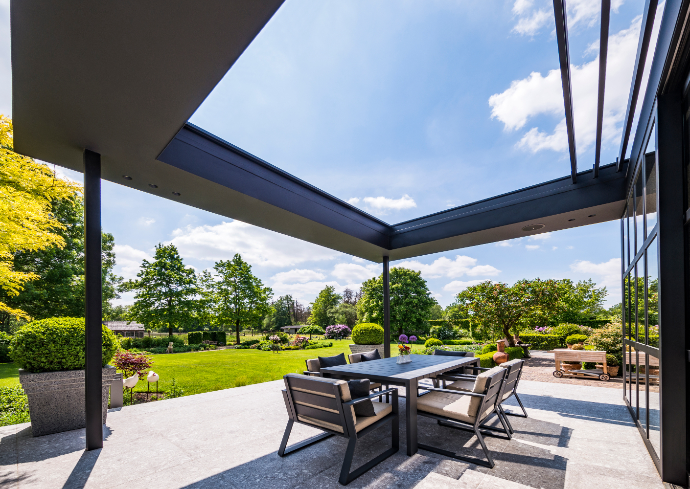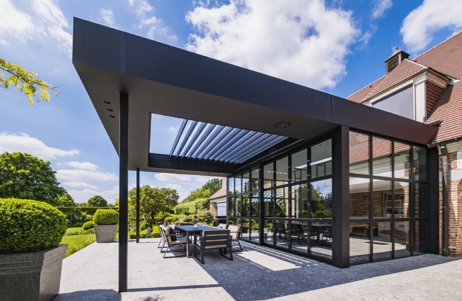 Aero Skye - это навес для патио с решетчатой крышей, обеспечивающий защиту как от солнца, так и от дождя. Вне зависимости от погоды и времени года вы можете выйти на улицу, чтобы подышать свежим воздухом, когда захотите, благодаря Renson Aero Skye.