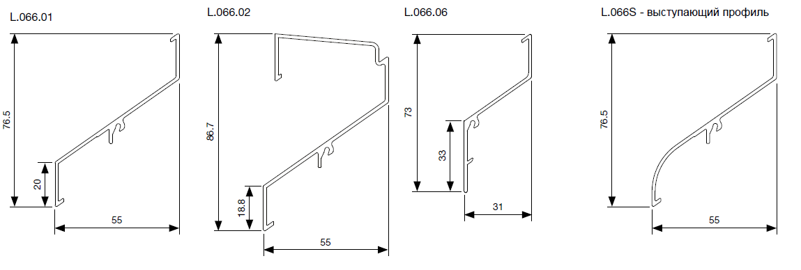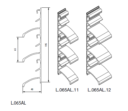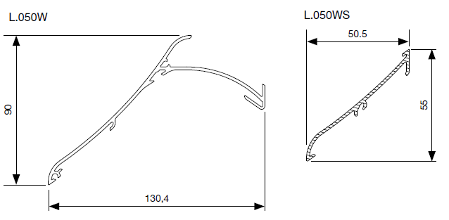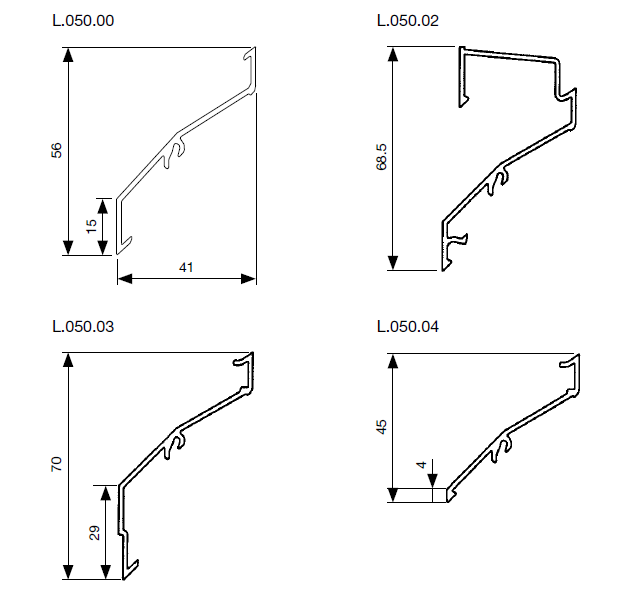 Ламель L.050.00 также может изгибаться с минимальным радиусом 800 мм. Верхняя ламель L.050.02 доступна для эстетичного верхнего присоединения. Длинная нижняя ламель L.050.03 и короткая нижняя ламель L.050.04 для оптимального завершения конструкции.