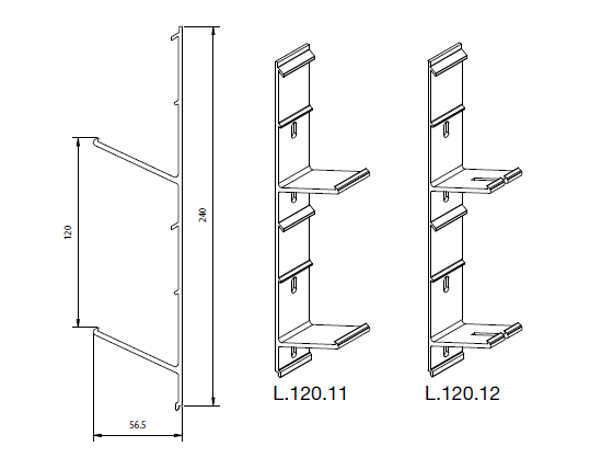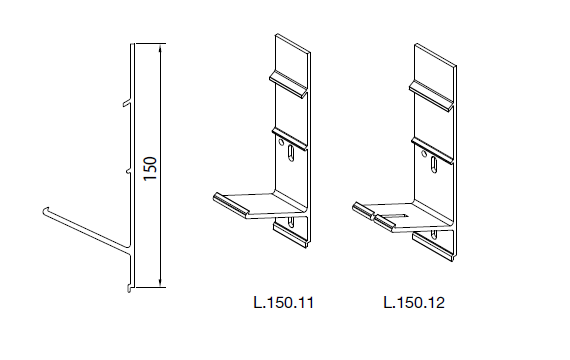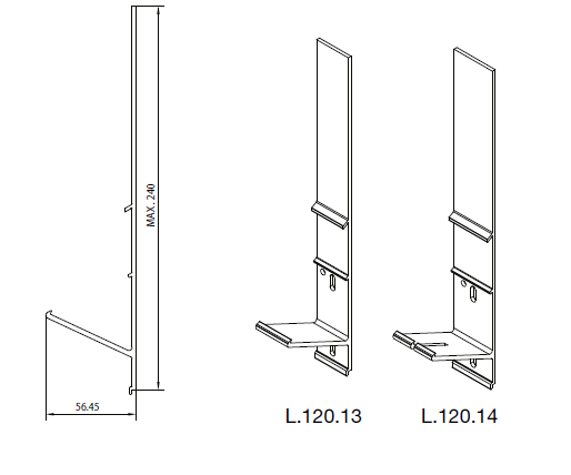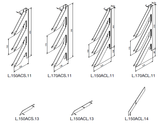 • Одиночный держатель ламели: тип L.120.11 (ширина: 28 мм) • Двойной держатель ламели для термического расширения: L.120.12 (ширина: 34 мм) (соединительная деталь для двух ламелей) • Держатели ламелей для переменных шагов 120-240 мм - Одиночный держатель ламели: тип L.120.13 (ширина: 28 мм) - Двойной держатель ламели для термического расширения: L.120.14 (ширина: 34 мм) (соединительная деталь для двух ламелей)