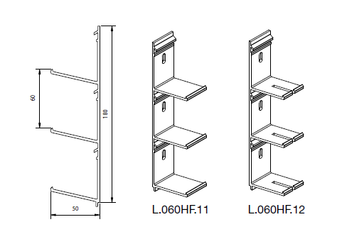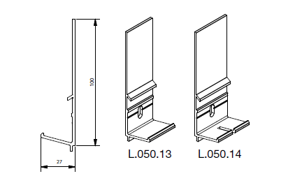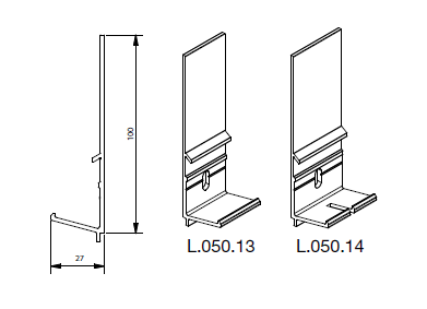 • Держатели ламелей для шага 50 мм - Одиночный держатель ламели: тип L.050.11 (ширина 28 мм) - Двойной держатель ламели для термического расширения: тип L.050.12 (ширина 34 мм) (соединительная деталь для двух ламелей) • Держатели ламелей для переменного шага 50 - 100 мм - Одиночный держатель ламели: тип L.050.13 (ширина 28 мм) - Двойной держатель ламели для термического расширения: тип L.050.14 (ширина 34 мм) (соединительная деталь для двух ламелей)