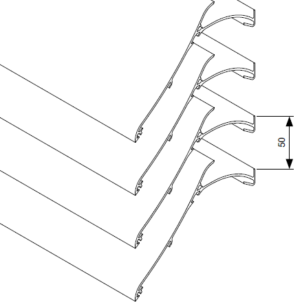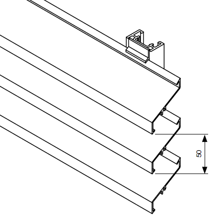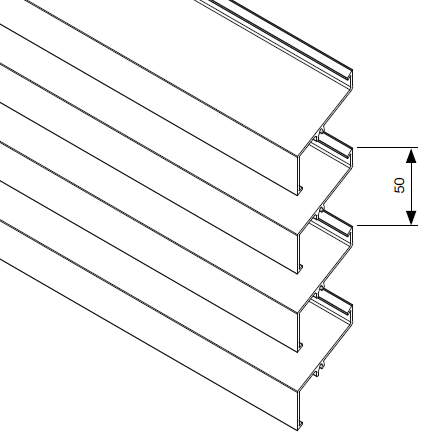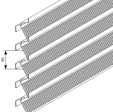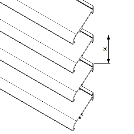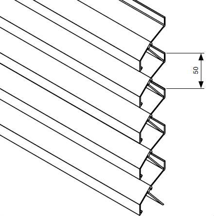 Мощный профиль из экструдированного алюминия с шагом 50 мм для очень сильного воздушного потока. Переменный шаг 50 - 100 мм возможен с держателями ламелей типов L.050.13 и L.050.14 (см. чертеж ниже). Часто можно видеть, что шаг ламелей отражает эстетику общего дизайна проекта.