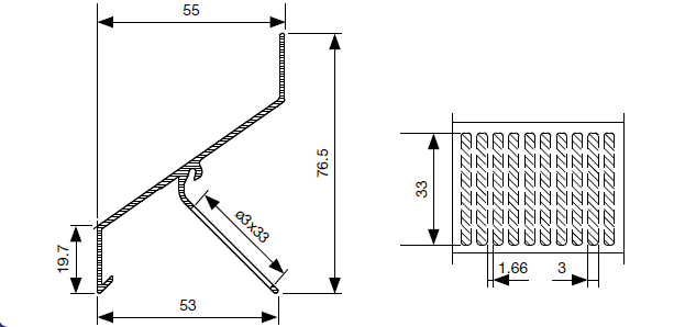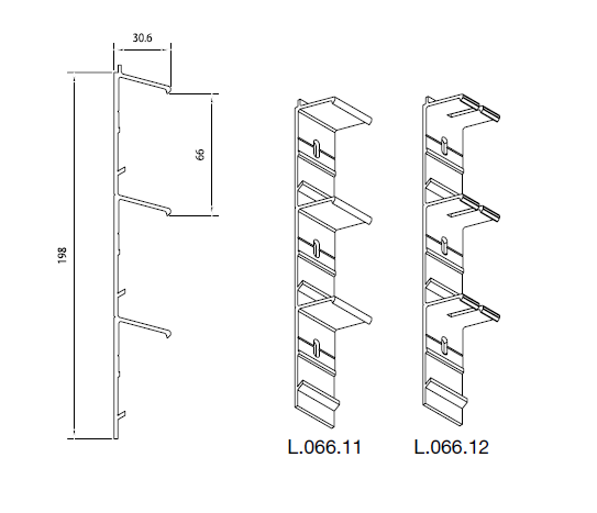 Одиночный держатель ламели: тип L.066.11 (ширина: 28 мм) - Двойной держатель ламели для термического расширения: L.066.12 (ширина: 34 мм) (соединительная деталь для двух ламелей) - Держатели ламелей одинаковые для всех ламелей типа L.066. Только они устанавливаюся вверх ногами для ламели типа L.066V.