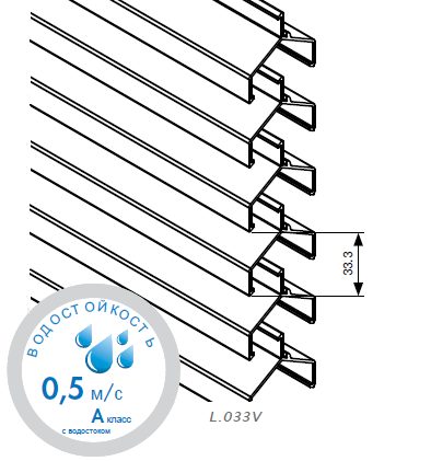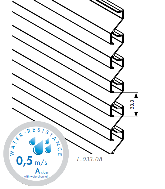Новая погодоустойчивая ламель L.075W испытана согласно стандарту EN13030:2001, имеется сертификат BSRIA. Имея класс A2 при скорости ветра 13 м/с и скорости всасывания воздуха 0 м/с, эта ламель подходит для применений, требующих отвод воздуха и водостойкость. Ламели с шагом 75 мм для простй и невидимой сборки за счет защелкивания ламелей в держателях, объединенных в систему.