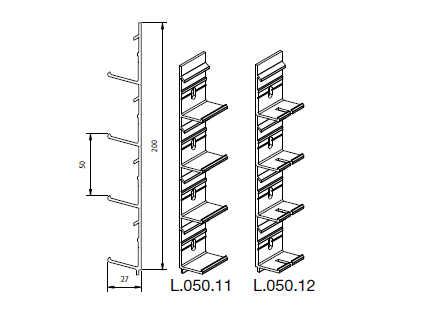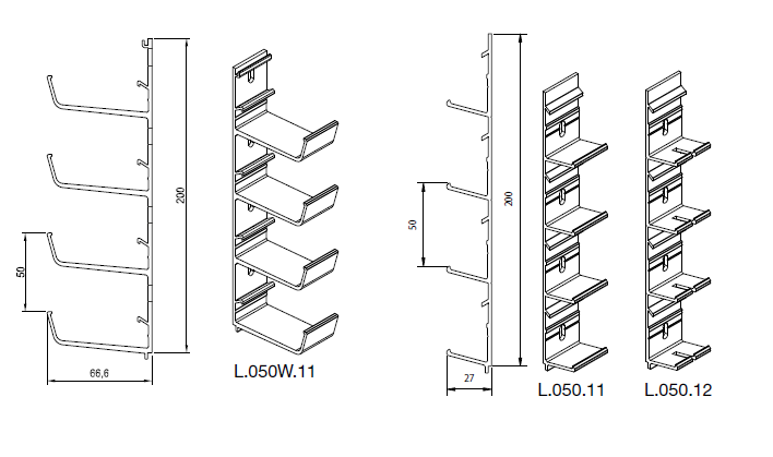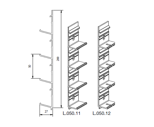 • Держатели ламелей для шага 50 мм - Одиночный держатель ламели: тип L.050.11 (ширина 28 мм) - Двойной держатель ламели для термического расширения: типы L.050.12 (ширина 34 мм) (соединительная деталь для двух ламелей) • Держатели ламелей для переменного шага 50 - 100 мм - Одиночный держатель ламели: тип L.050.13 (ширина 28 мм) - Двойной держатель ламели для термического расширения: типы L.050.14 (ширина 34 мм) (соединительная деталь для двух ламелей)